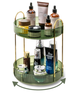Upgrade your vanity with this 2-tier rotating makeup organizer, designed to hold all your skincare, cosmetics, and perfumes in one stylish place. The spinning feature allows easy access, while the sleek pastel green finish complements a nature-inspired bathroom.